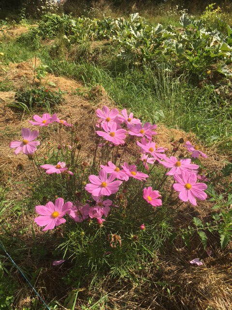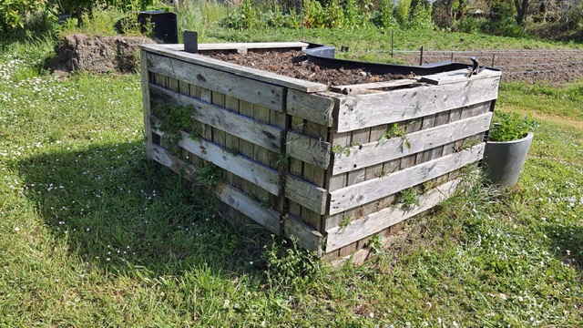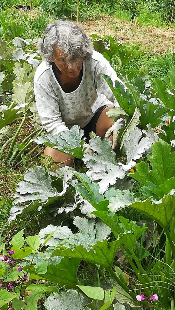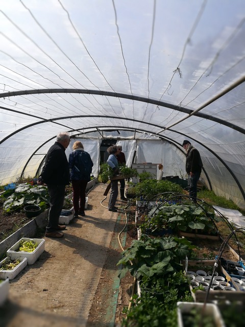 Nous observons des arbres fruitiers, divers espaces délimités où poussent des légumes associés à des fleurs, une serre permettant les semis sur place dès février et la culture de quelques légumes primeurs, une aire plantée de hauts piquets, à leur pieds un trou accueillant quelques feuilles d’ortie et bientôt des plants de tomates. Plusieurs jardinières et jardiniers bénévoles s’affairent aux pieds des piquets, d’autres vers des salades, des poireaux; deux hommes transposent avec une fourche des matières compostées d’une cellule à l’autre de l’aire de compostage qui en comporte six et donne au final un magnifique terreau noir.