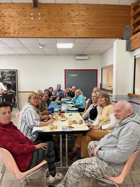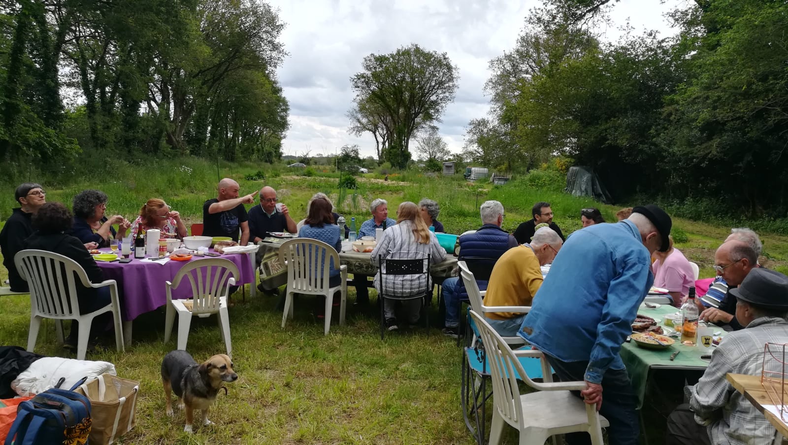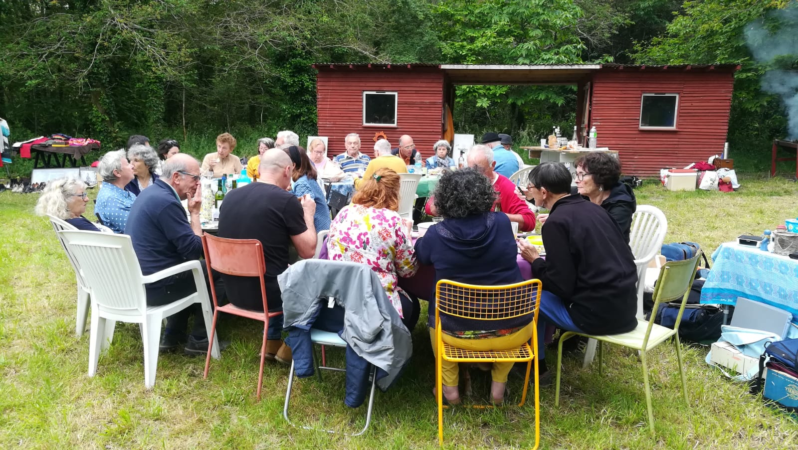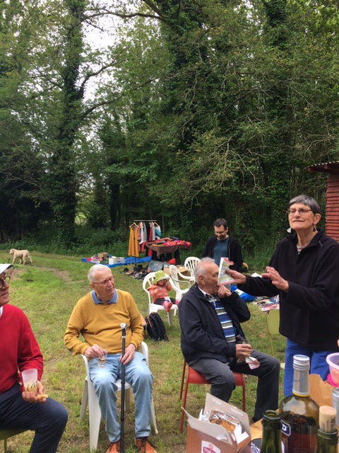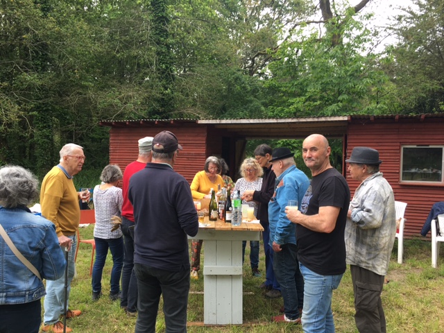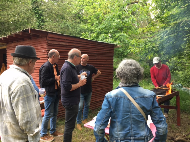 Dès le milieu de matinée, Alain s’est occupé du feu pour avoir de belles braises au moment du déjeuner/pique-nique. Des adhérents nous ont rejoints pour ce moment convivial où les langues allaient bon train. Après un apéro bien garni, les 22 participants ont partagé grillades, salades et délicieux gâteaux amenés par chacun. Une averse aussi brève que soudaine nous a cueillis au moment du dessert : décidément, ce printemps est bien capricieux !