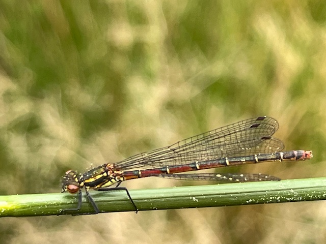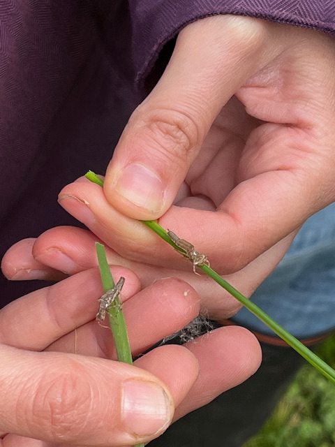 Nous nous sommes ensuite approchés des berges pour voir quelques demoiselles, en train de faire sécher leurs ailes au sortir de leur état larvaire et avons trouvé de très nombreuses exuvies accrochées au végétaux de bords de mare : il s’agit des mues laissées par les larves au fur et à mesure de leur croissance. Les enfants étaient ravis de pouvoir en emporter, comme autant de trésors témoignant de cette chasse un peu particulière.