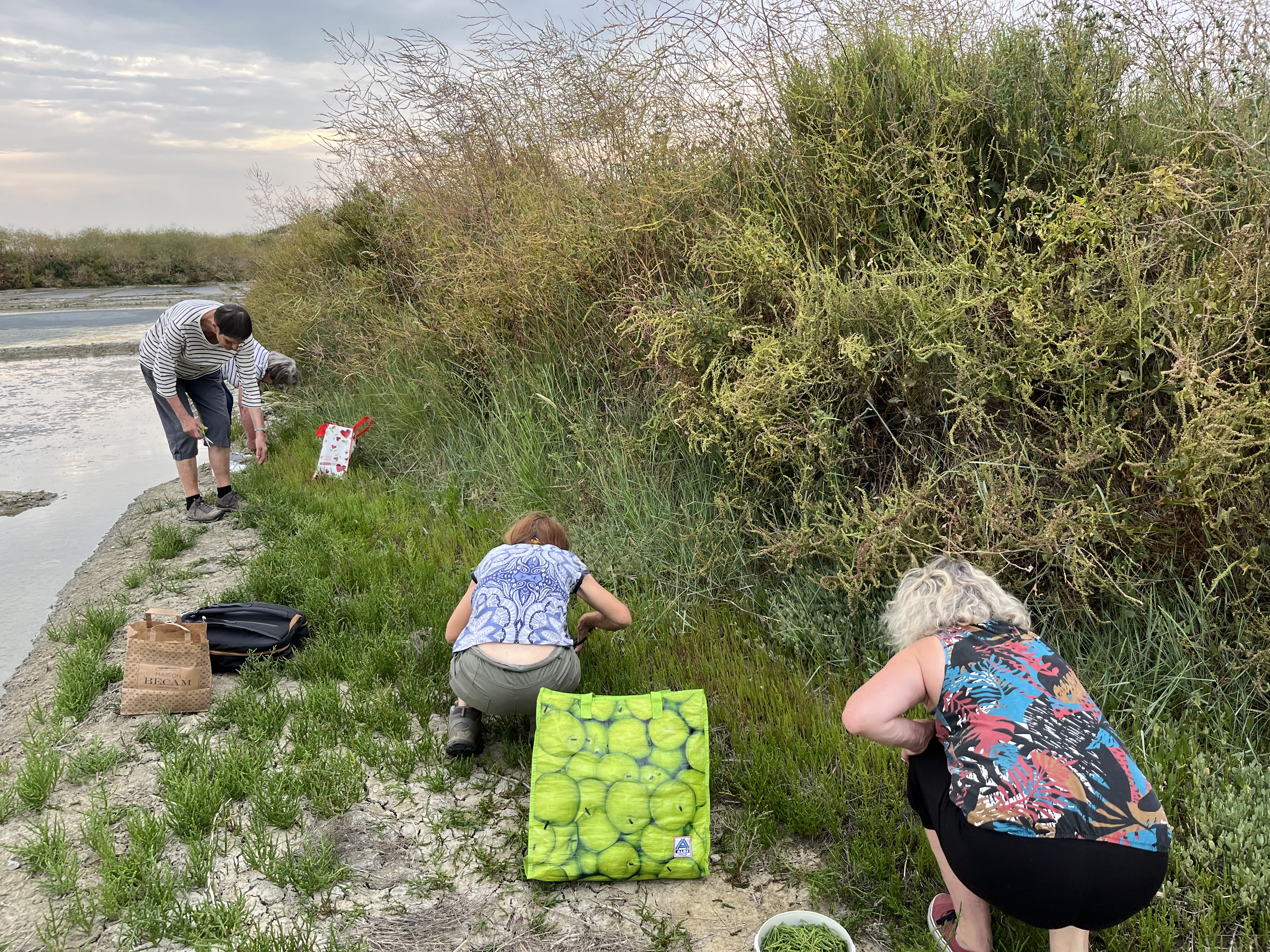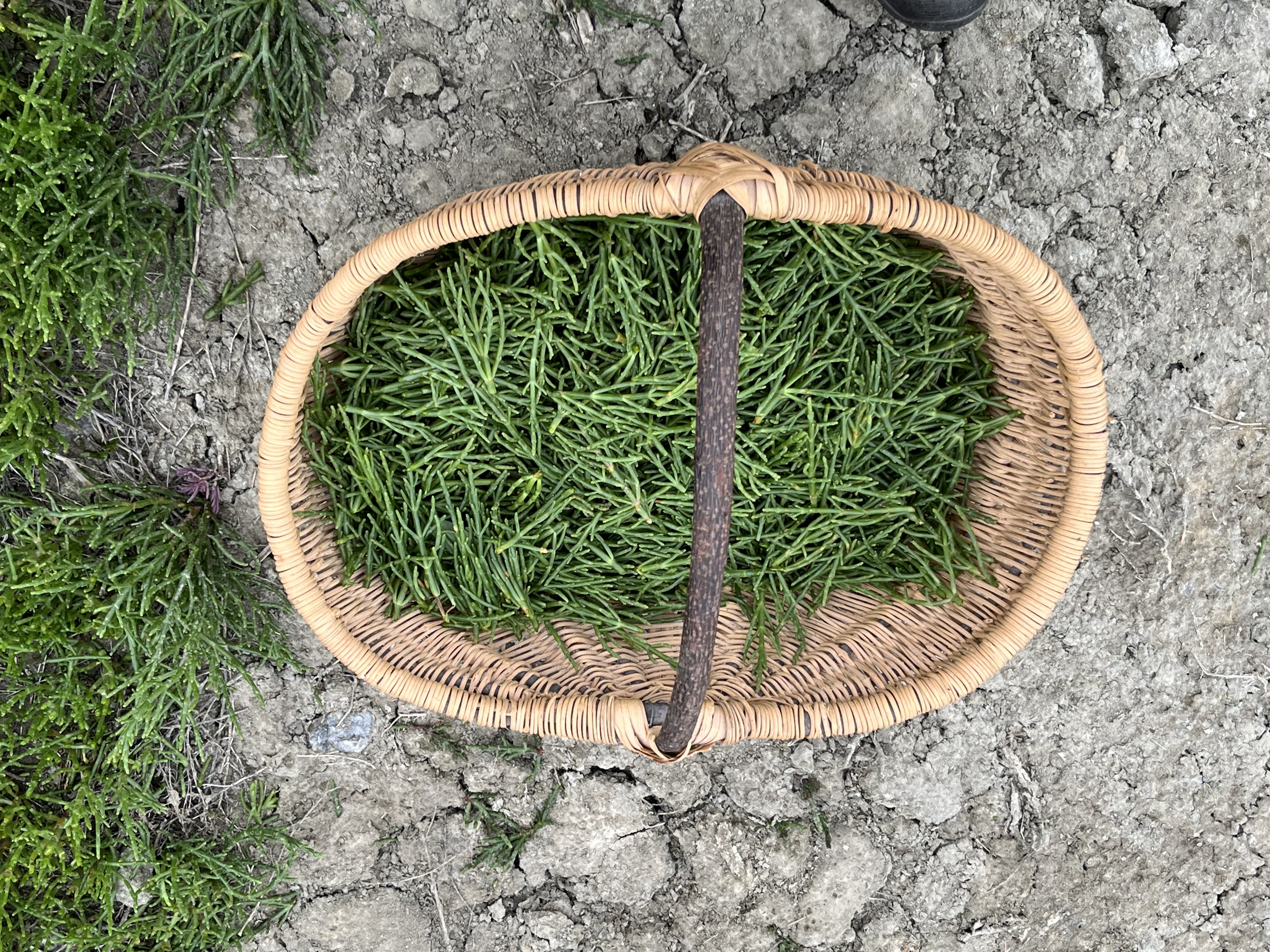 Armés de récipients et de ciseaux, il ne nous a pas fallu longtemps pour faire une cueillette généreuse. Nous sommes en début de saison et la salicorne est tendre et abondante. Elle peut même se déguster crue…à condition de n’être pas soumis à un régime sans sel !