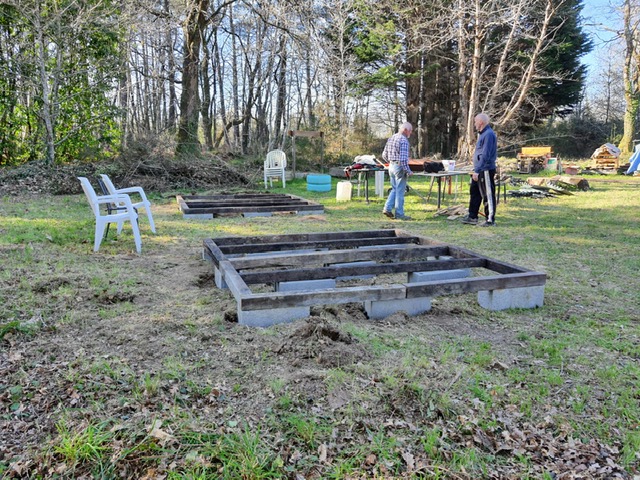 Le chantier de construction des abris de jardin va également bon train. Les soubassements sont terminés et la structure est en cours de construction grâce aux piquets récupérés par Hervé et Olivier chez des mytiliculteurs de Pénestin et au bois des palettes qui sont activement démontées par Alain, Gilles, Olivier aidés de Bernadette.